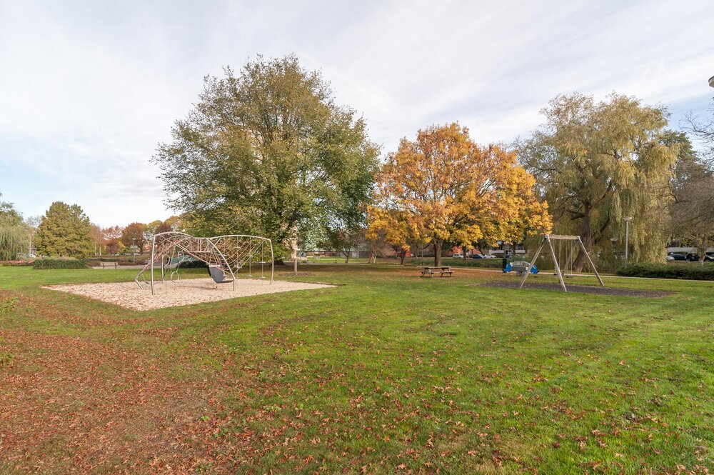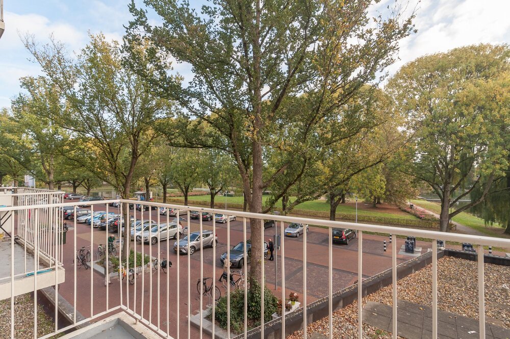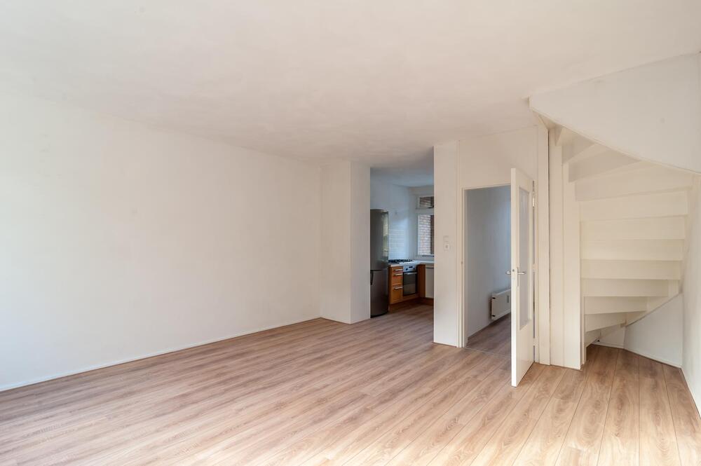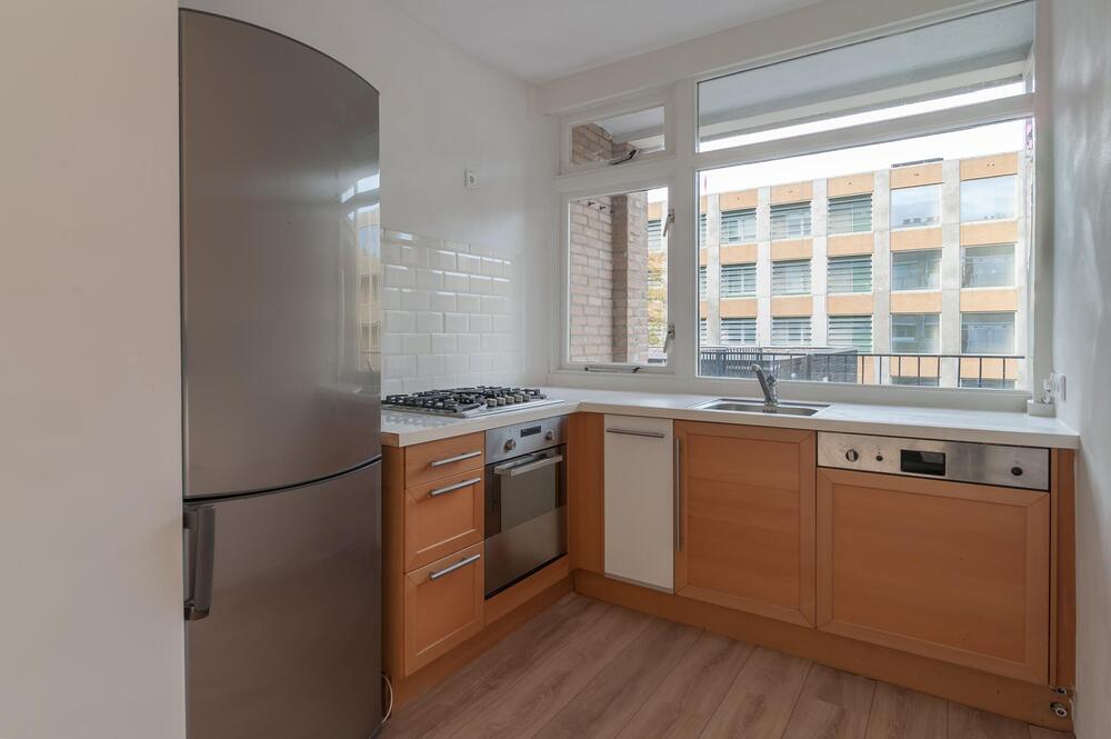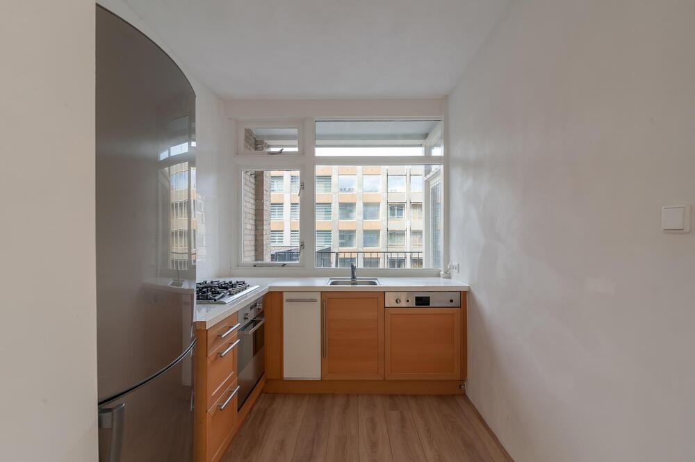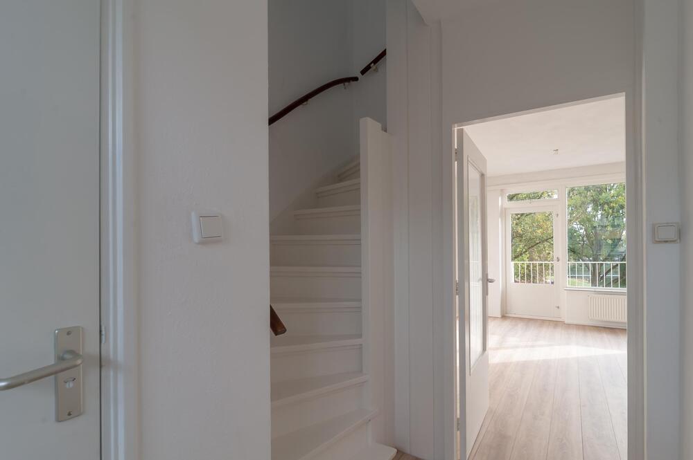 Eerste woonlaag: entree/hal met vaste kast waarin de wasmachine-aansluiting, toilet met fontein, lichte woonkamer met half open keuken en een deur naar balkon met mooi uitzicht op het Hendrik de Vriesplantsoen.