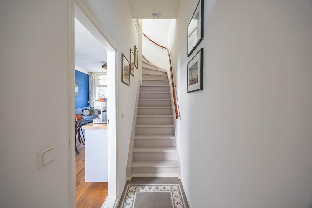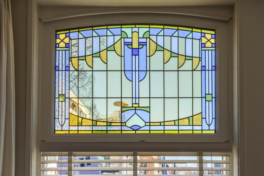 Begane grond: entree/hal, modern hangtoilet met fontein en deur naar de living. De woonkamer met open keuken (samen 31 m2) met prachtige houten vloer. Door de mooie hoge ramen met glas in lood en het ruim 3 meter hoge plafond voelt de ruimte royaal en licht aan. De moderne (2020) keuken is v.v. inbouwapparatuur.