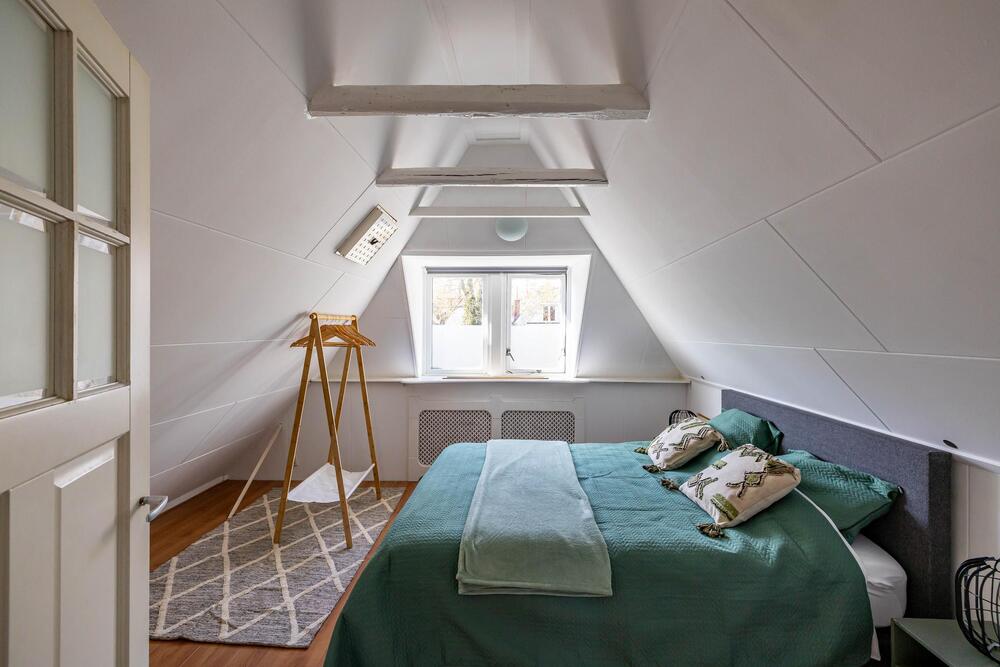 Riante doorzonwoonkamer (ca. 40 m²) met grote raampartijen aan beide zijden, fraai hoog balkenplafond, houten vloerdelen en een praktische inbouwkast. Open trap naar de slaapverdieping.
