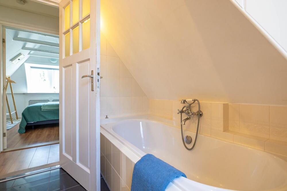 Overloop met inbouwkast, toegang tot de slaapkamer (ca. 11 m²) en de ruime badkamer met ligbad, inloopdouche, wastafel en tweede toilet.