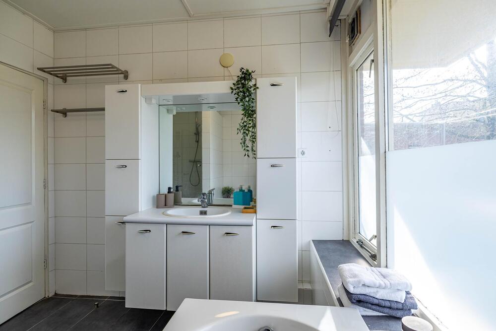 Aan de achterzijde een slaapkamer (ca. 7 m2) met toegang tot het achtergelegen balkon (westen; middag en avondzon). Badkamer (ca. 8 m2) met ligbad, douche en wastafelmeubel.