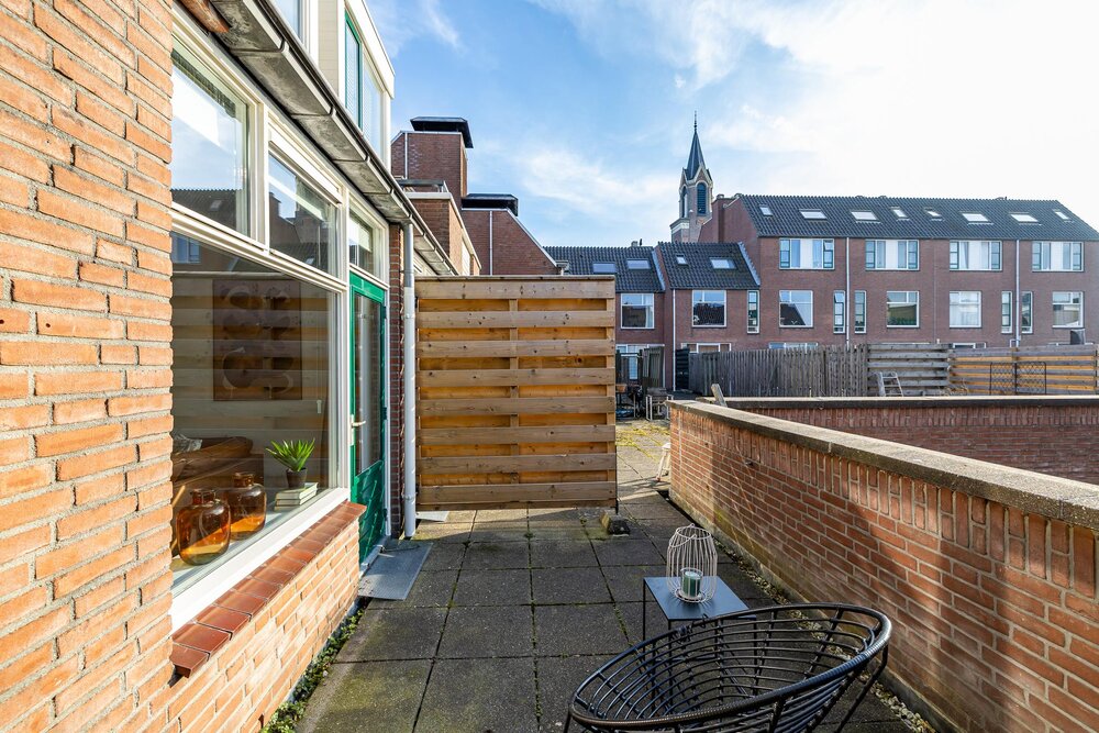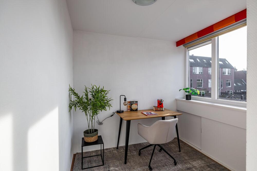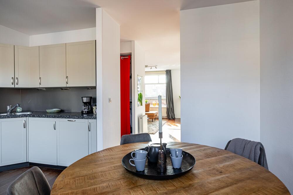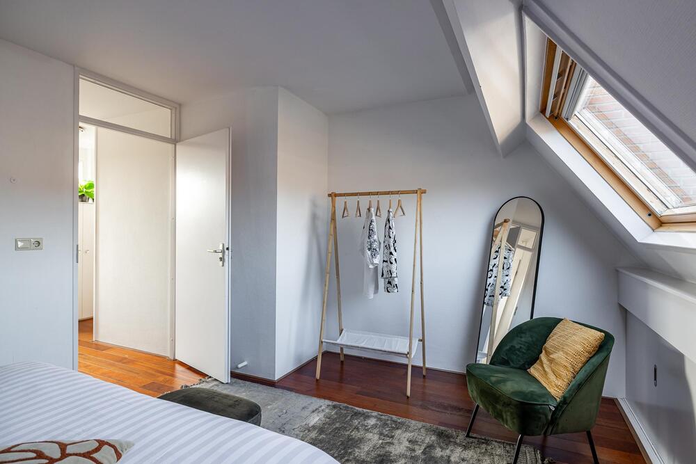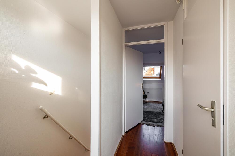 Eerste verdieping: royale living (ca. 42 m2) met aan de voorzijde het zitgedeelte met dakterras (georiënteerd op west, dus middag- en avondzon, 12 m2) en doorloop naar een tussenhal (met toilet en cv-opstelling) en aan de achterzijde de woonkeuken. Deze is voorzien van inbouwapparatuur en meer dan voldoende opbergruimte.