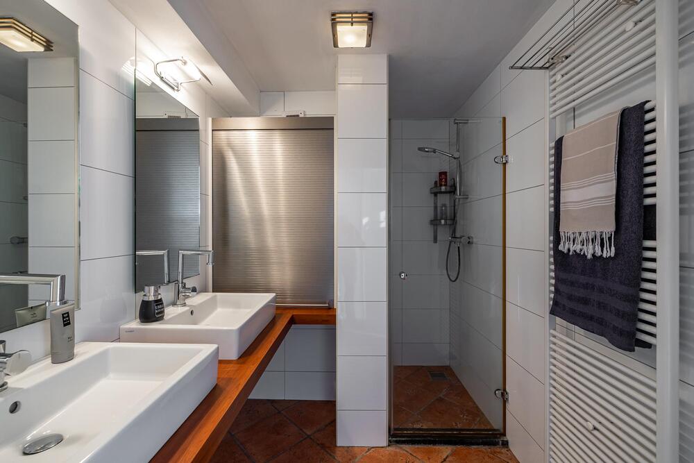 Tweede verdieping: overloop met deur naar balkon (4 m2). Twee slaapkamers (15 en 6 m2) en een nette badkamer (ca. 4 m2) met douche en dubbele wastafel.